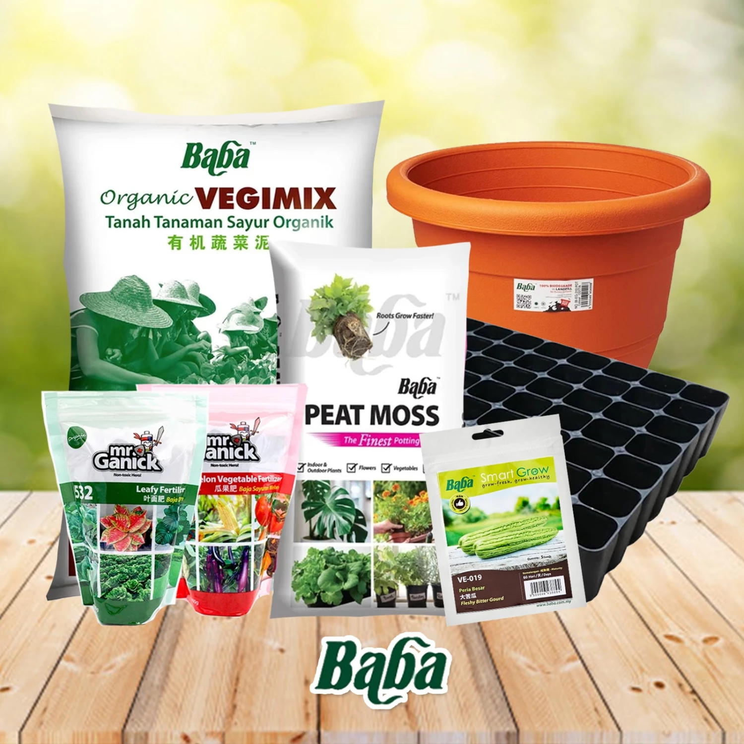 Bittergourd Bundle Pack consists of 1 x 28L Organic Vegimix Soil, 1 x 5L Peat Moss, 1 x Cotta Round Pot (310mm), 1 x Seedling Tray (77 Holes), 1 x Fleshy Bitter Gourd Seeds, 1 x Organic Foliage Fertilizers (400g) and 1 x Organic Fruiting fertilizers (400g)