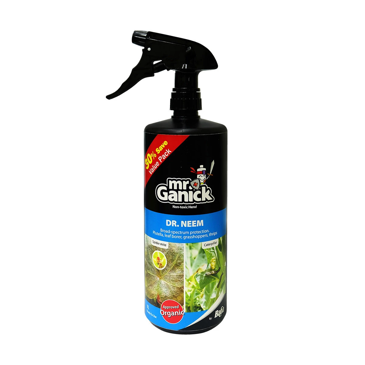MR. GARNICK series Dr. Neem Organic Insecticide is non toxic, 100 percent natural pesticides. The insect growth disruptor ingredients is made of neem oil and fab seed oil, which has antifeedant and repellent effect. It can effectively prevent more than 40 types of pests which includes grass hopper, thrip, plutella and spider mite. Recommended to use once every morning or late evening during cool weather.