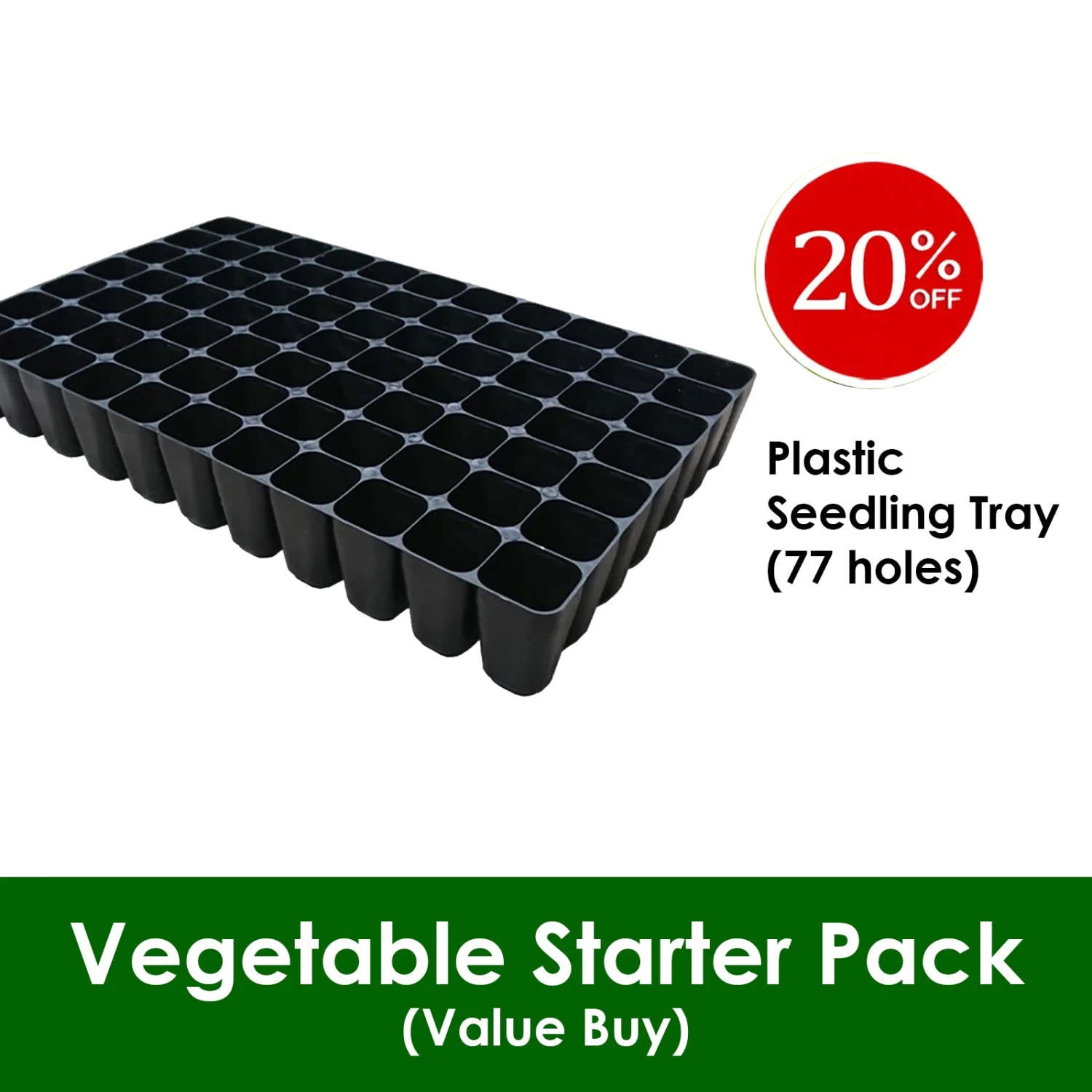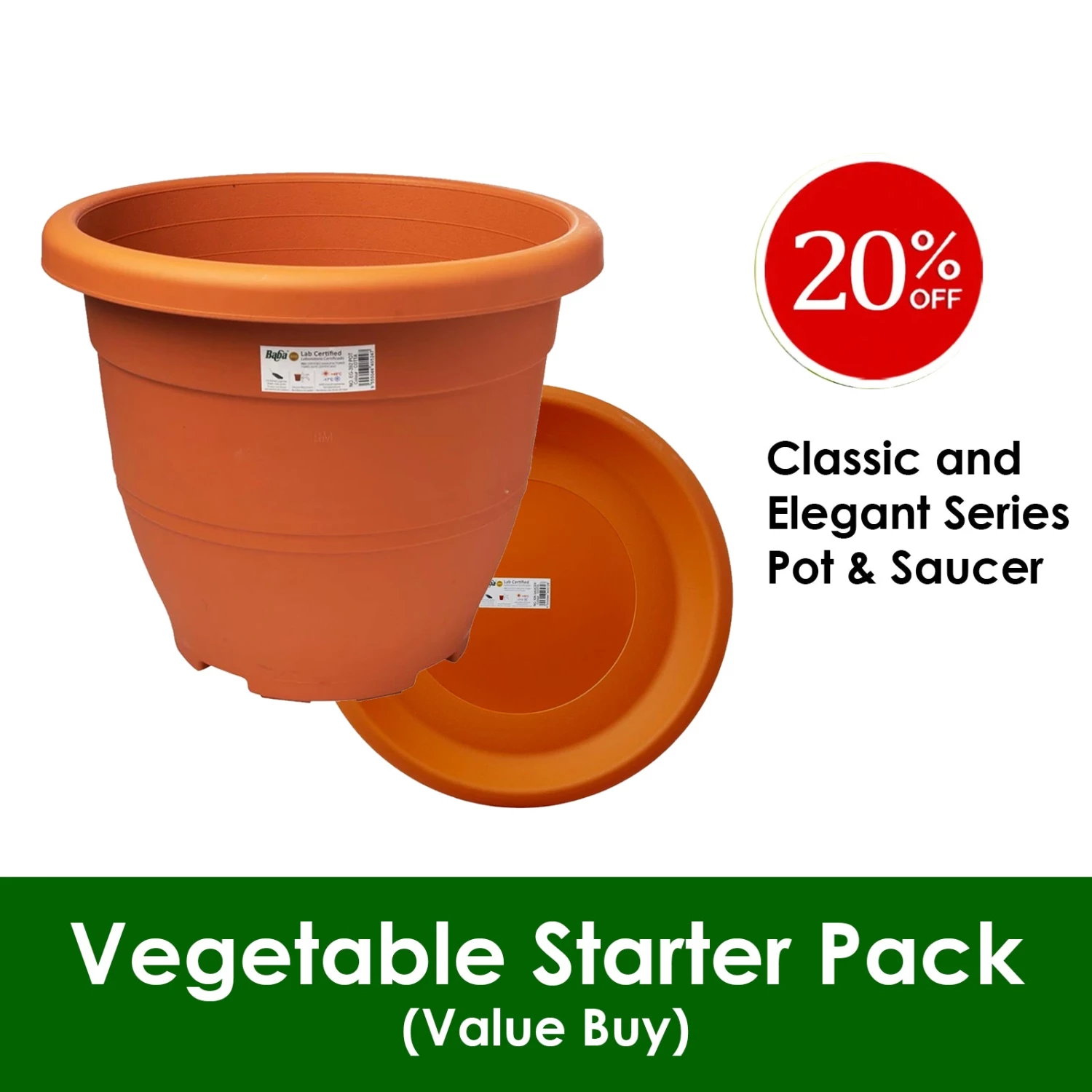 Vegetable Starter Pack consists of 1 x 40L Pokon Organic Vegetable Soil, 1 x 5L Peat Moss, 1 x Cotta Round Pot (310mm), 1 x Cotta Saucer, 1 x Seedling Tray (77 Holes), 1 x Japanese Kale Seeds, 1 x Water Convolvulus (Kang Kong) Seeds and 1 x Organic Foliage Fertilizers (400g)