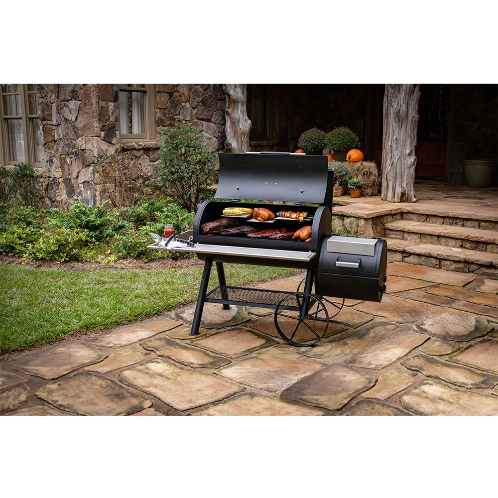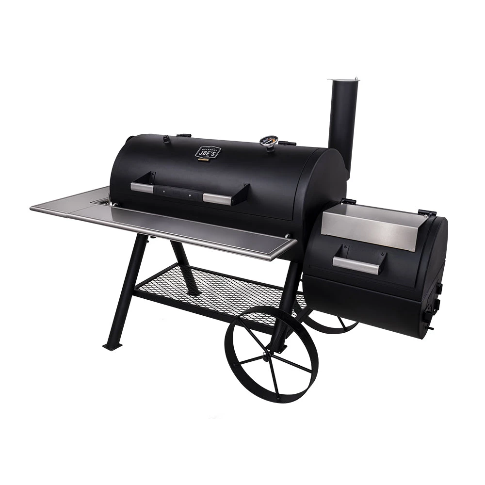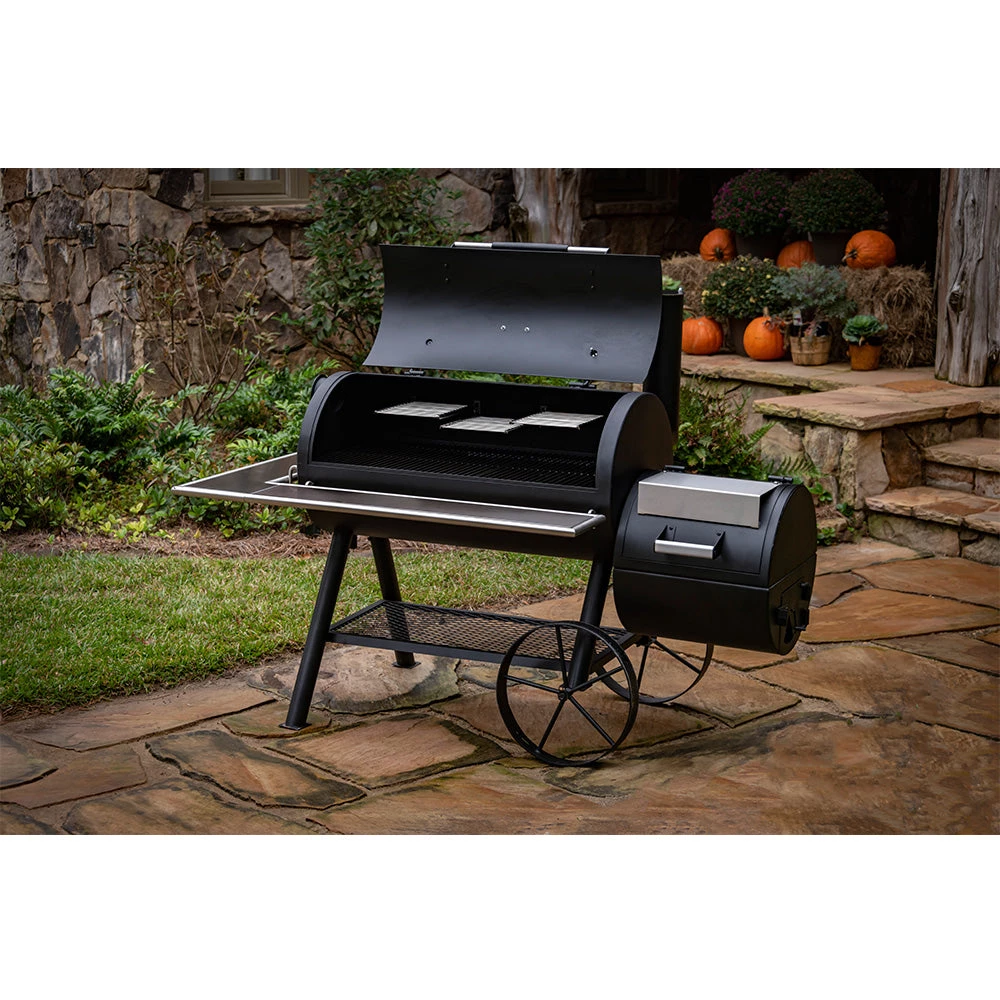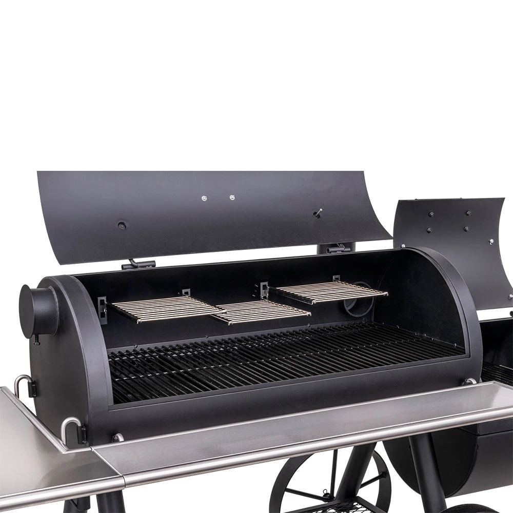 - Optional smokestack locations let you choose between reverse flow smoking and traditional offset smoking