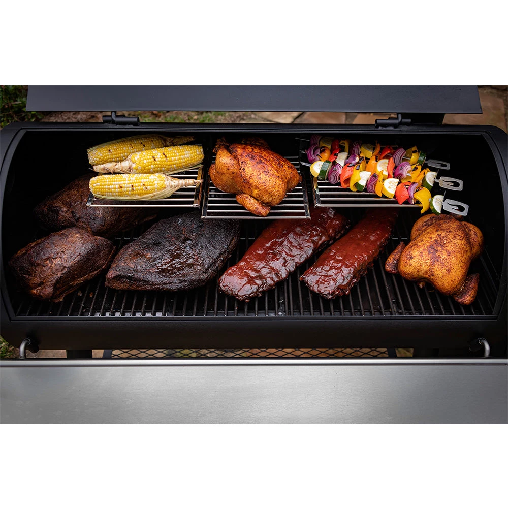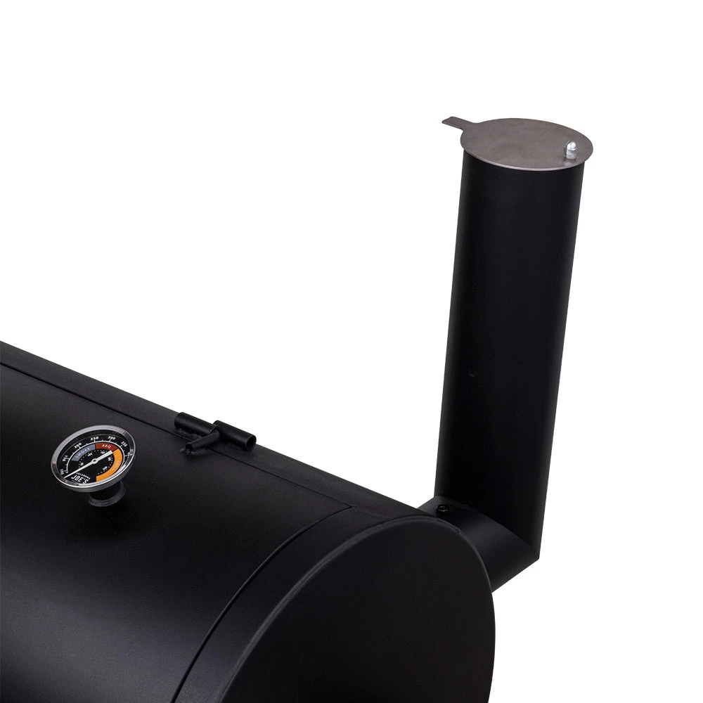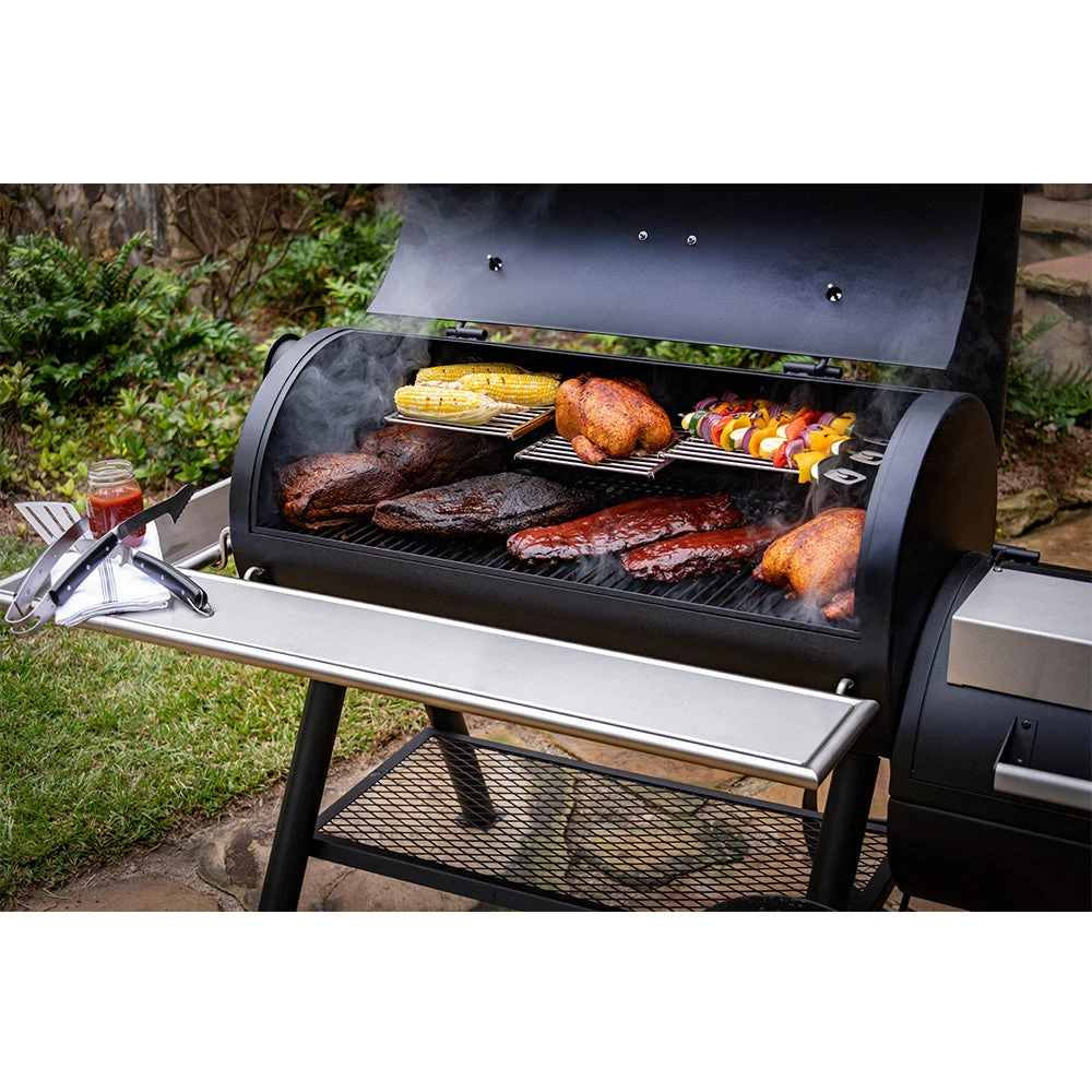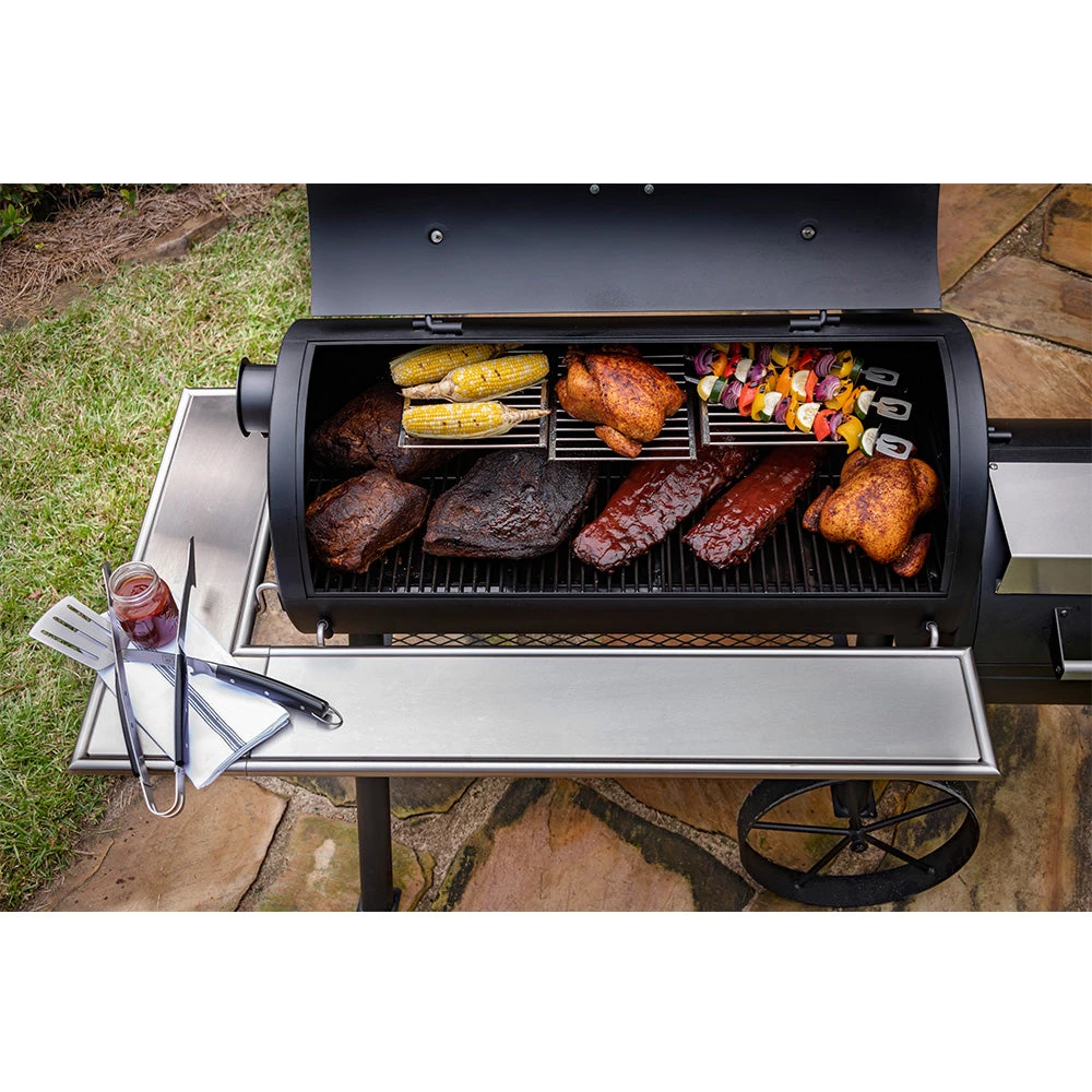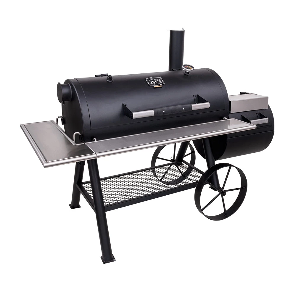 - Optional smokestack locations let you choose between reverse flow smoking and traditional offset smoking