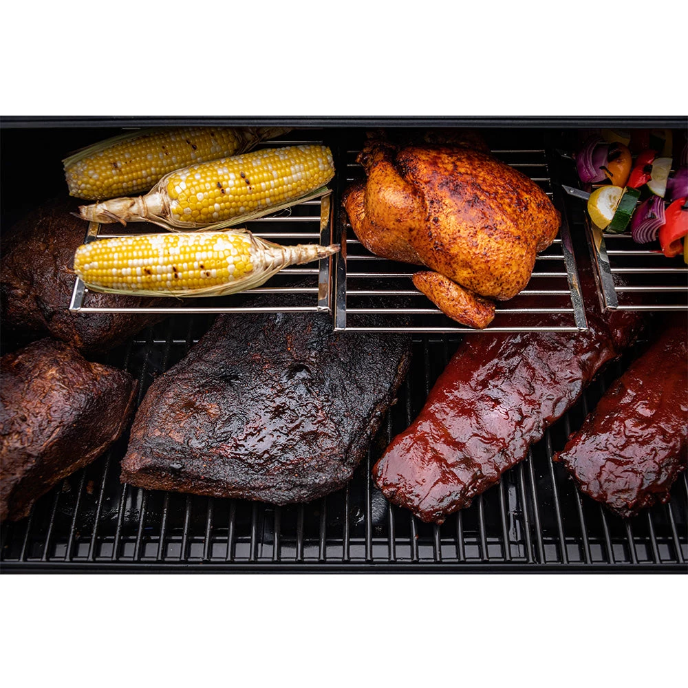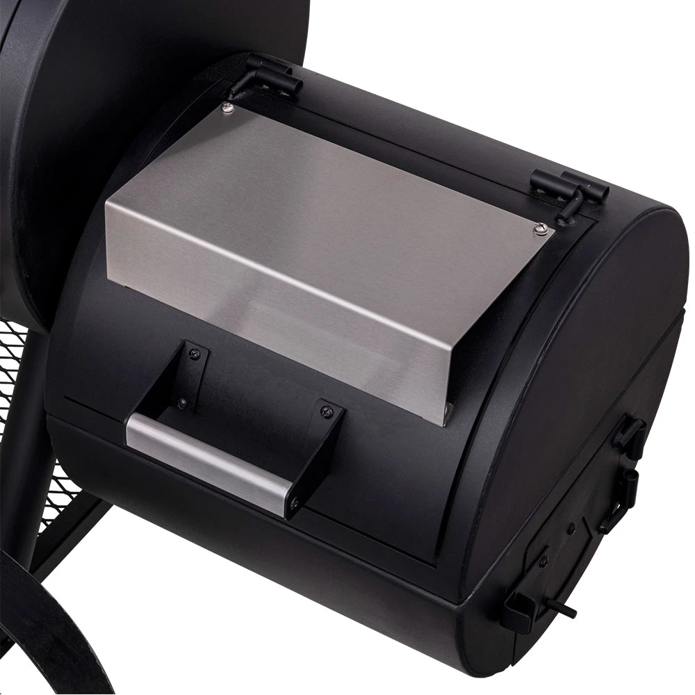 - Four baffles locked under porcelain-coated wire grates deliver even heat and smoke through the cooking chamber