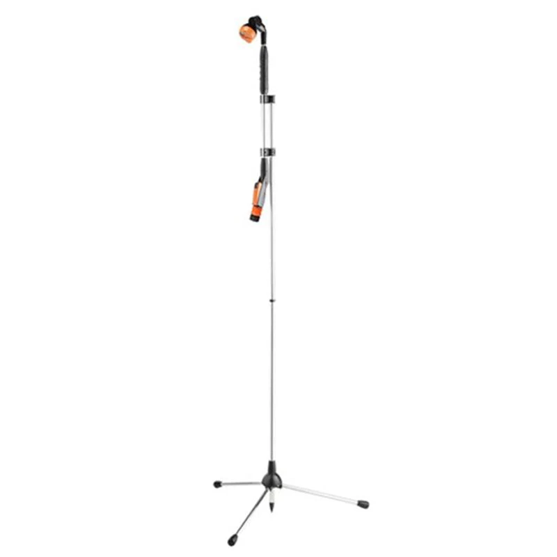 2 in 1 shower and spray lance. Versatile garden shower. Rustproof aluminum tripod with spike for maximum stability. Height adjustable from 175 to 225 cm Converts handily into a practical spray lance with telescopic rod. Ergonomic horizontal grip with shallow-angled outlet. Rustproof aluminum rod. Handy front-mounted push-button mechanism for controlling and shutting off the water flow. 2 flow settings. Swivel spray head equipped with 4 different jets. Shower, concentrated, aerated and mist. Made in Italy.