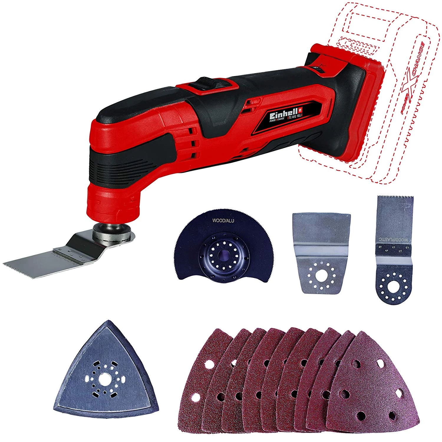 The Einhell cordless multifunctional TC-MG 18 Li – Solo tool is a flexible, high-quality helper for extension, renovation and restoration jobs. Its comprehensive features help to make easy work of jobs such as sawing, grinding/sanding or scraping. It is a member of the Power-X-Change family, so users enjoy all of the advantages of Einhell’s high-end lithium-ion technology. This cordless multifunctional tool is a high-quality tool designed for ergonomic operation, so it saves a great deal of effort when used in practice. The multifunctional tool is also fitted with an oscillation decoupled battery uptake for vibration reduction. The magnetic tool fixation enables the user to change tools quickly and easily. The chuck also has twelve adjustable settings. The speed electronics allows the tool to be adapted to the particular material and application. The TC-MG 18 Li – Solo operates at 22,000 to 40,000 vibrations for precision working. A soft grip ensures a safe and comfortable operation. The product is supplied with a triangular grinding/sanding plate and a set of nine sheets of abrasive paper with different grit sizes (3*P60/3*P80/3*P120). A scraper, a plunge-cut blade for wood and plastic (HCS), as well as a segment saw blade additionally for soft metal (HSS) are all part of the package. The TC-MG 18 Li-Solo is a member of the Power X-Change family. The advantages of a cordless tool are obvious: cables that get in the way, trip hazards and the distractions caused by restricted movement are all a thing of the past thanks to the new generation of powerful and long-lasting cordless tools from Einhell. The batteries with the high-grade lithium-ion cells can be used for all members of the Power X-Change family. This product comes without a battery and charger, which are available separately.