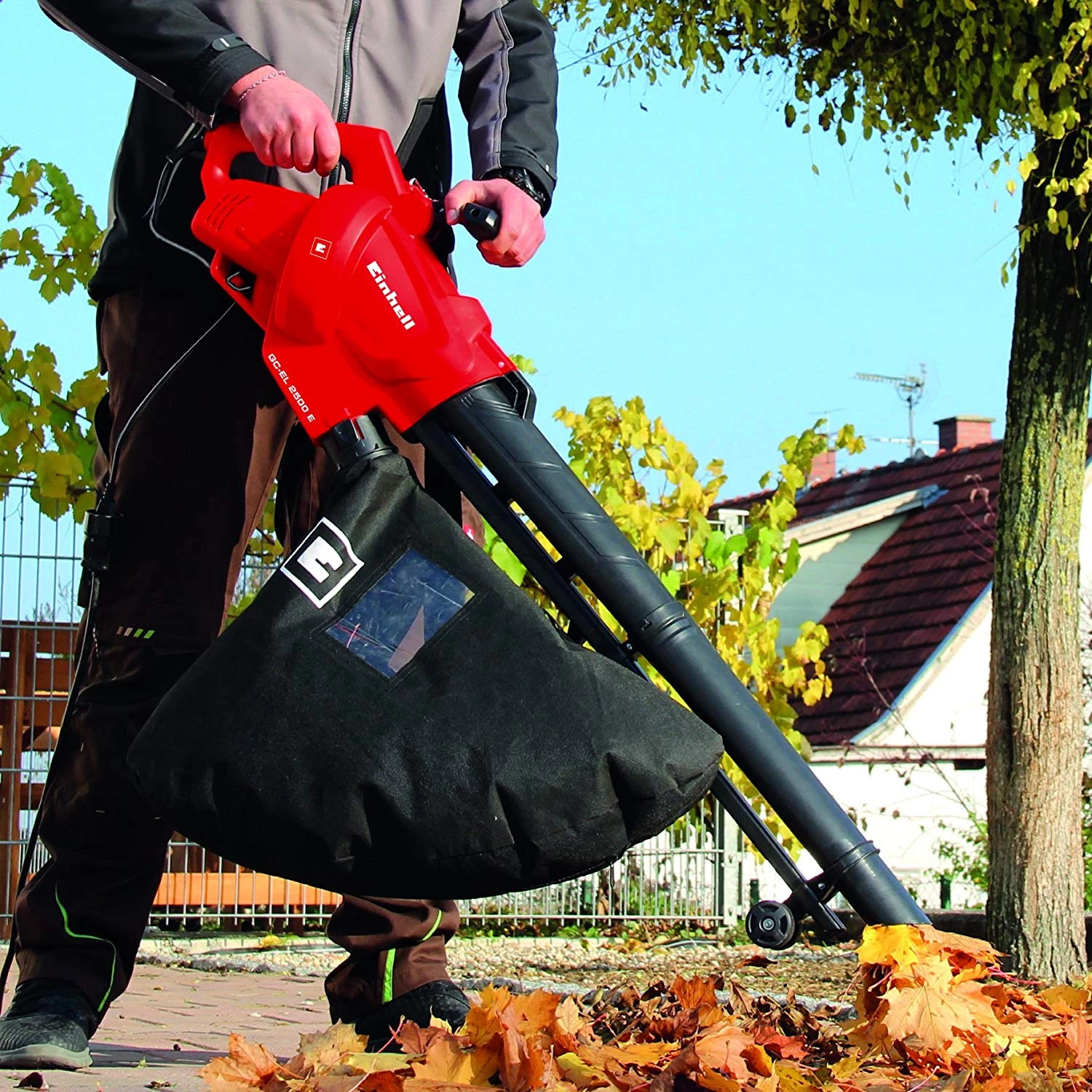 The GC-EL 2500 E electric blower vac is a powerful tool and reliable helper for gardeners who want to clean up their grounds and gardens. The change-over between the blow and vacuum function without tools allows the blower vac to be quickly adjusted to the job in hand. The electronic speed control enables the suction and blowing power to be exactly dosed. Two guide rollers ensure comfortable and back-friendly operation on paths, lawns and difficult terrain. A large, two-piece suction tube directs even large objects reliably and without jamming into the approx. 40 liter catch basket. Voluminous soft material such as foliage and grass is reduced to around 1/10th of its original size by the integrated shredding facility. With the adjustable carrying strap this electric blower vac can be comfortably carried over difficult terrain for back-friendly operation with minimum effort.