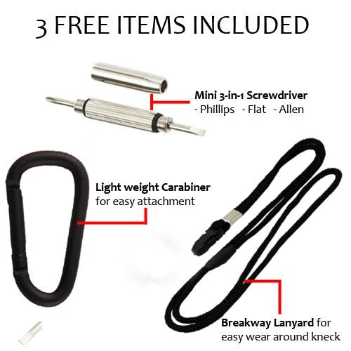 - 3 FREE ITEMS: Breakaway Lanyard + Carabiner + 3-in-1 Mini Screwdriver For Battery Replacement