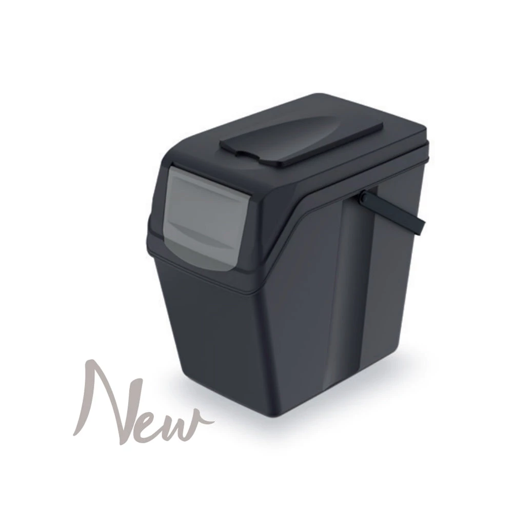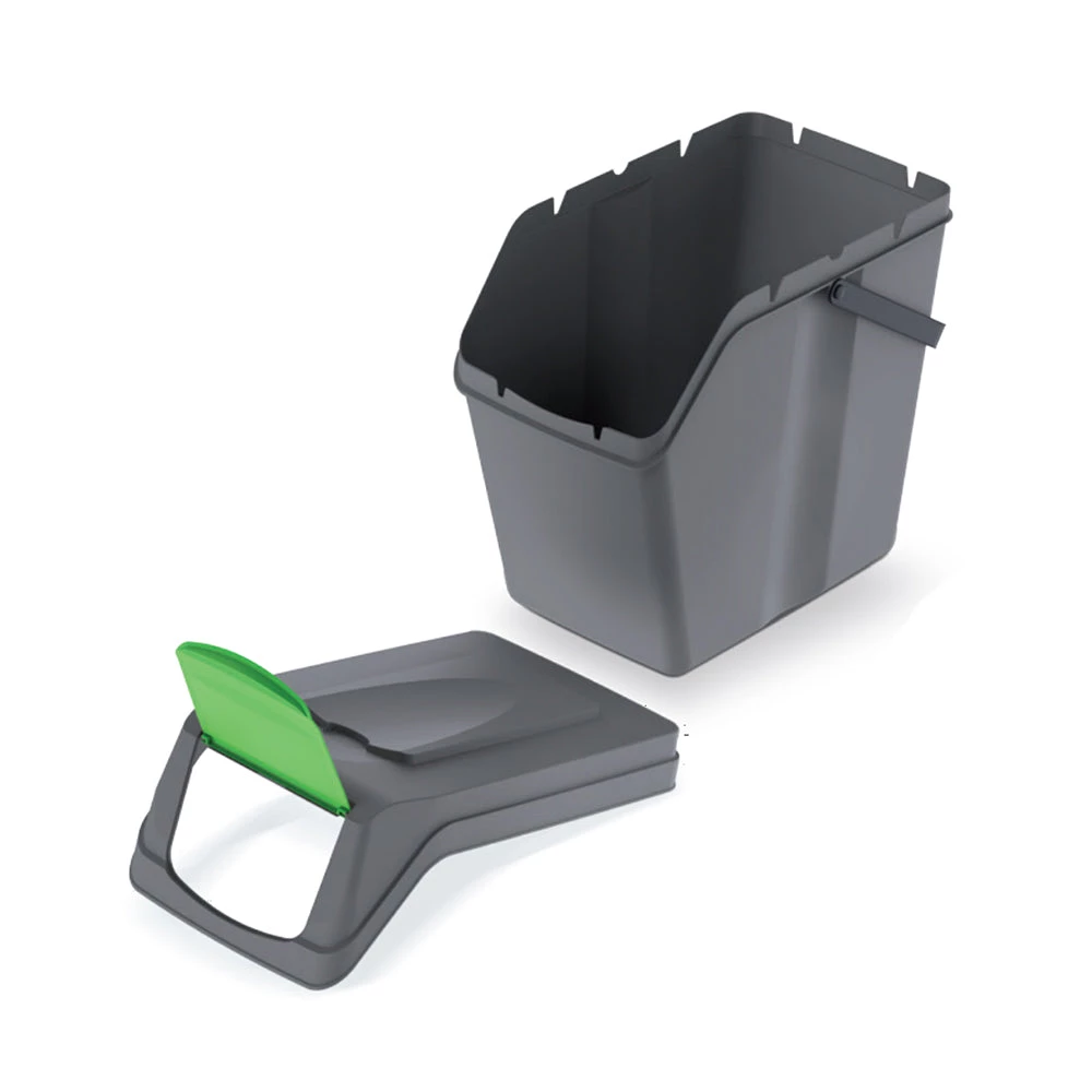 A set of three plastic containers for waste separation. The baskets are coloured for better orientation. The corresponding shape of the covers ensures stability when stacking. The Sortibox shape and the muted colours match the current design trends and combine the requirements with functionality.