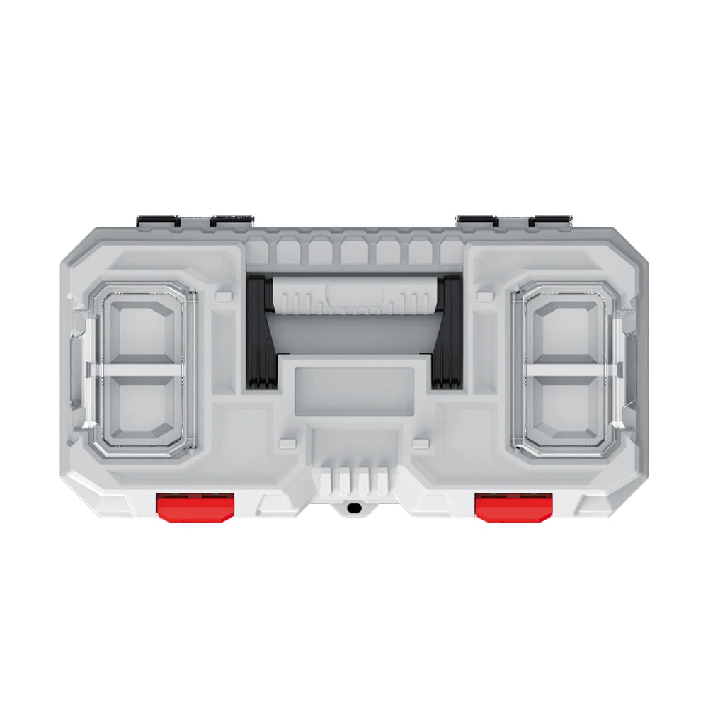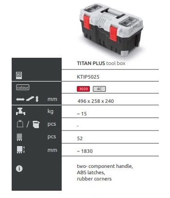 Kistenberg Titan Plus series high-quality multifunctional plastic toolbox is a 100% recyclable product, suitable for professionals and enthusiasts. Robust design to protect your tools, this toolbox also features two secure durable ABS latches and a padlock clasp for added security. It features a massive internal storage space, ideal for all manual and power tools, and features a tote tray and two inbuilt transparent organizers on top of the toolbox for smaller parts such as fasteners and fixings.