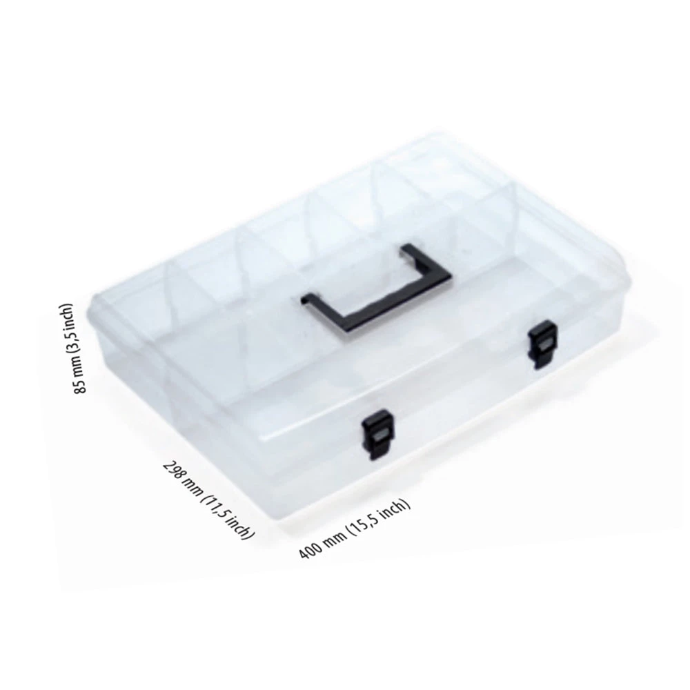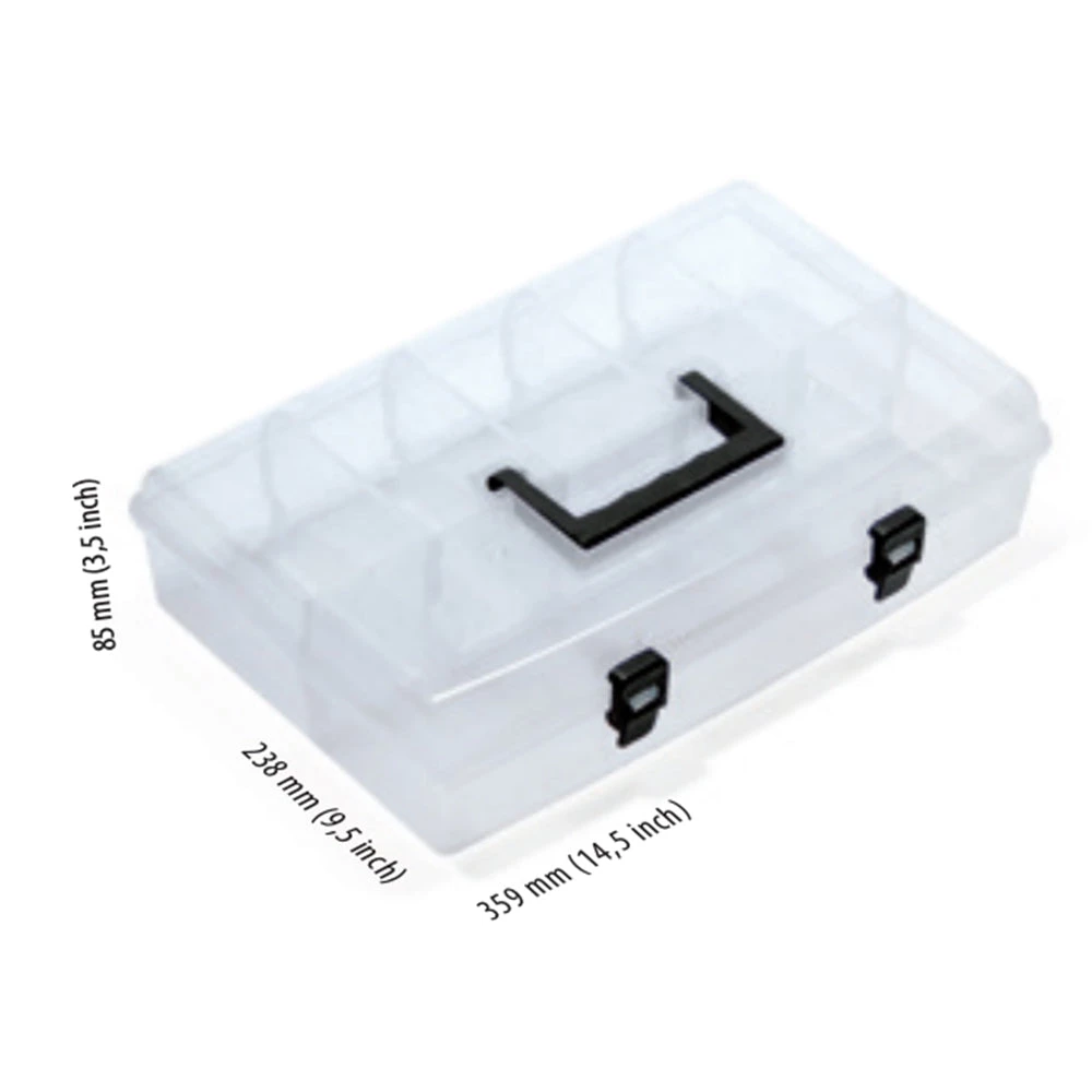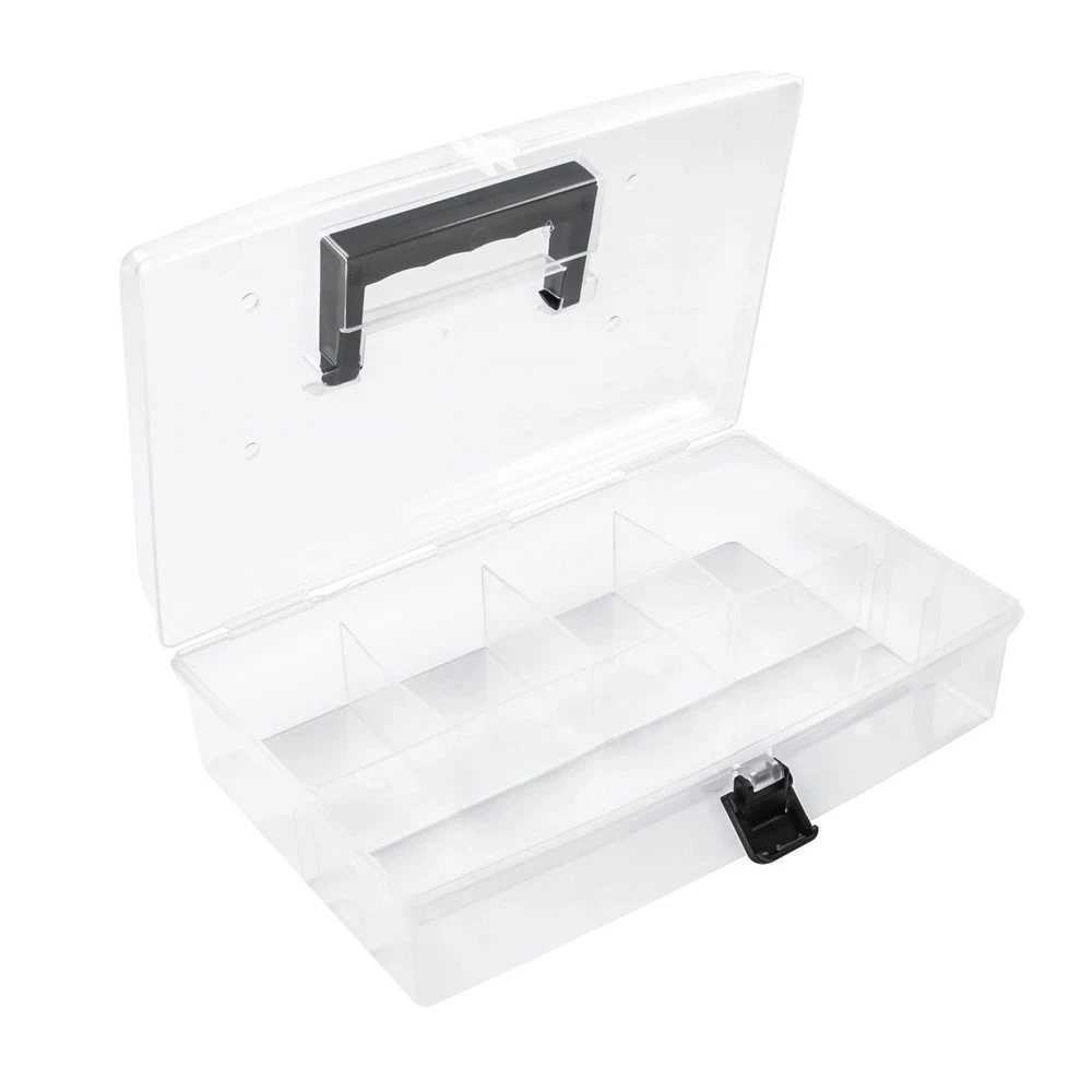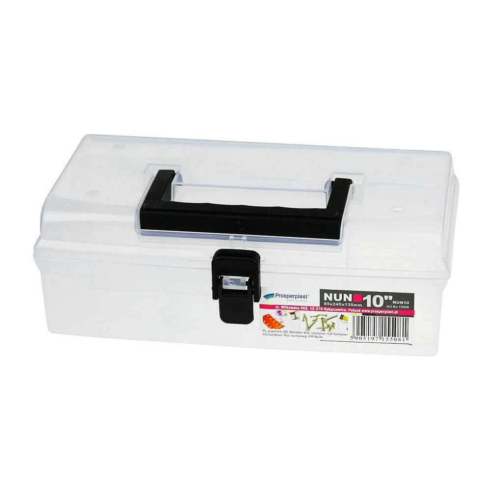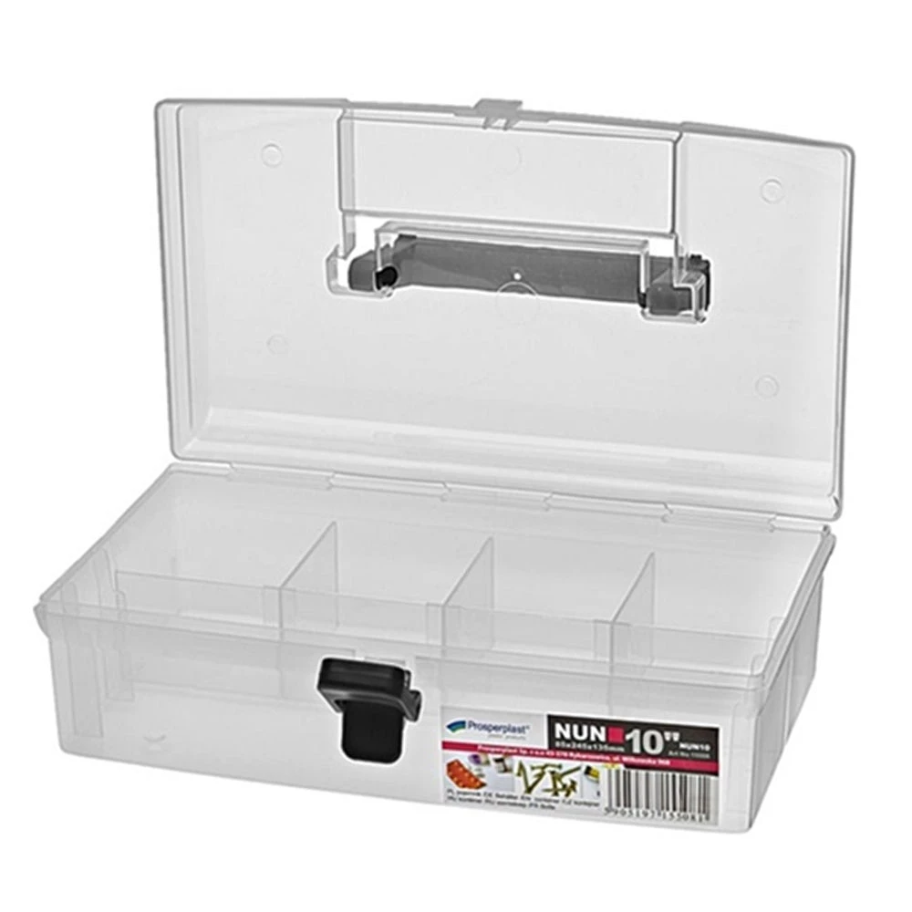 Prosperplast NUN series organiser box, simple and universal. The containers comes with separators allow it to fit various small objects. The organiser box is transparent, perfect visibility for easy accessibility. The foldable handle makes it easy to carry around. The organiser box is ideal for storing buttons, threads as well as small fishing tools and accessories. It is perfect to use as a container for storing DIY tools such as screws and nuts.