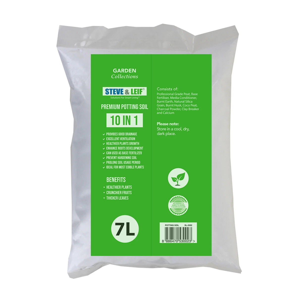 Steve & Leif 10 in 1 Premium Potting Soil is made of professional grade peat, base fertilizer, media conditioner, burnt earth, natural silica grain, burnt husk, coco peat, charcoal powder, clay breaker and calcium.