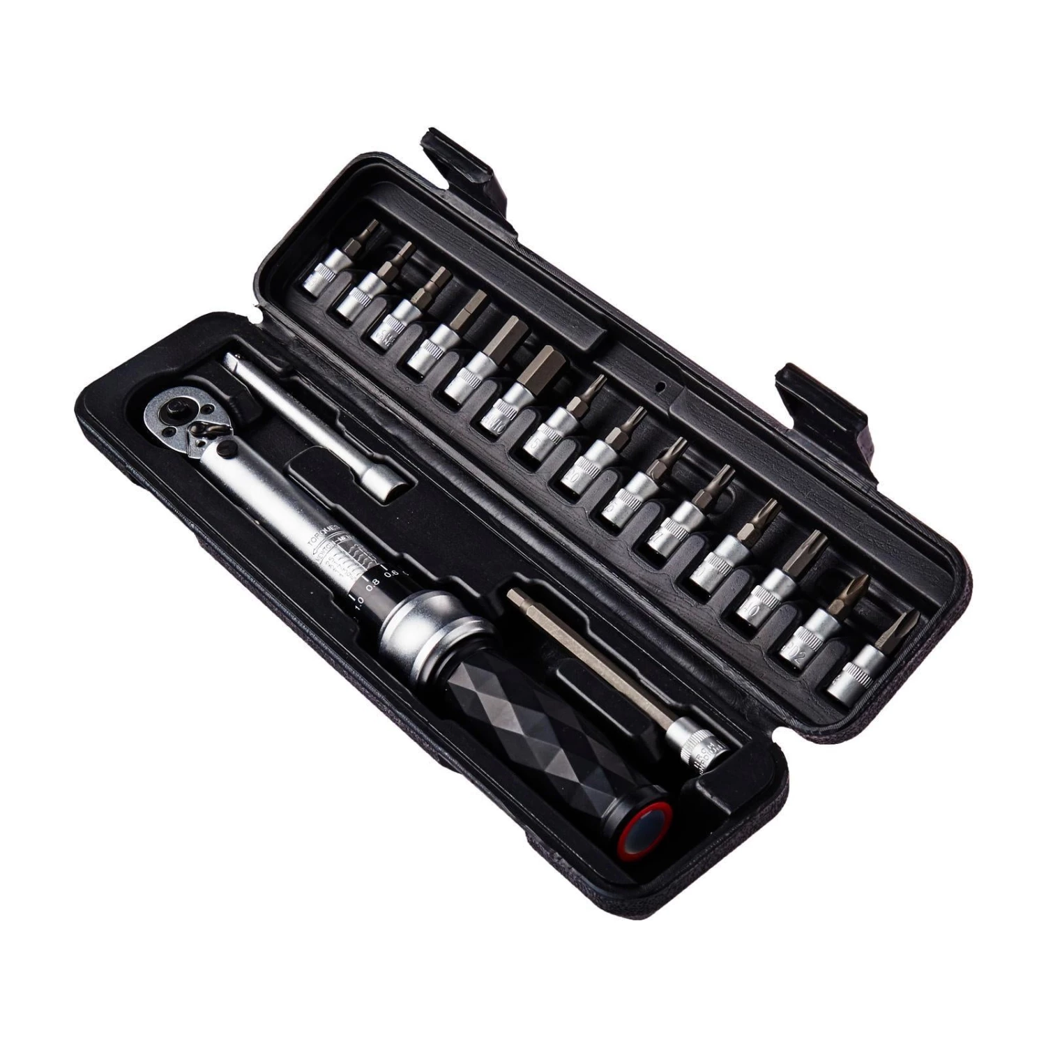 Torque Wrench Set is an essential tool to perform basic bike repair and maintenance. The high quality 1/4″ square drive socket torque wrench set includes H3/ H4/ H5/ H6/ H8/H10, T15/ T20/ T25 / T27/ T30 / T40, PH2/ PH3 bits. The wide selection of bits should guarantee that it will work with almost any bolt on your bike. Every bits is designed with a knurled collar which enables user to turn loose bolts in by hand until finger-tight, before bringing in the torque wrench to tighten to correct torque. It has a rating of 2-24 NM. It comes in a blow-molded black plastic box, made to house the wrench itself and all its bits. A metal double-hinge clasp keeps it shut. It is one important tool to have in your arsenal if you’re serious about wrenching on your own bikes.