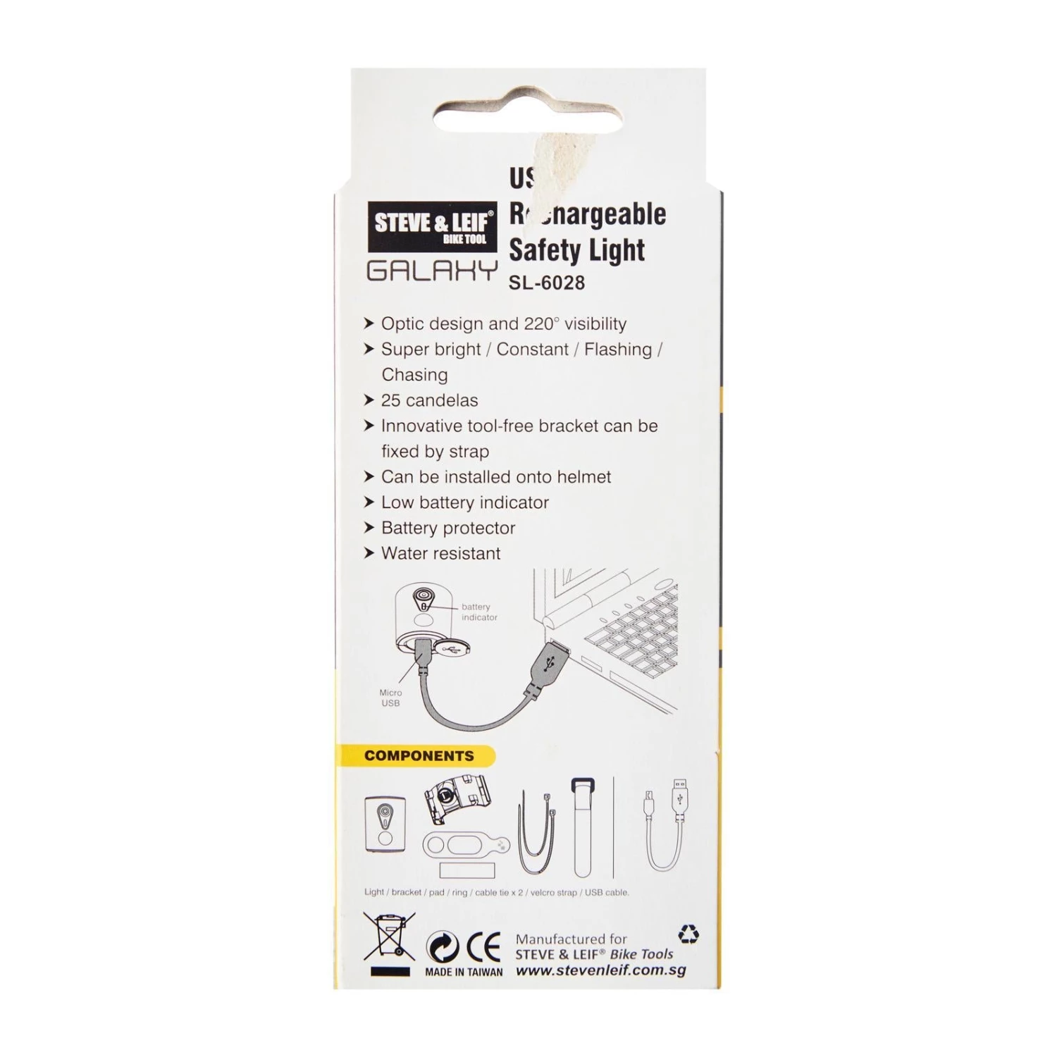 Steve & Leif Galaxy USB Rechargeable Bicycle/Bike 3 Red LED Bicycle Lights comes with rubber pad, cable ties, double back strap, USB cable and bracket. Easy charge by taking off the rubber cover at the end of the light and plug the USB into a USB outlet (Cable Free). Yellow light will be shown when power is lower than 20%, red light will be shown when it is charging and green light will appear when it is fully charged (approx. 2 hrs). The lights has 4 functions: Super bright, boost, constant and flashing. 3 Watt Hi-Power LED meets Danish standard. Product includes high power rechargeable lithium-ion polymer batteries. Quality product made in Taiwan.