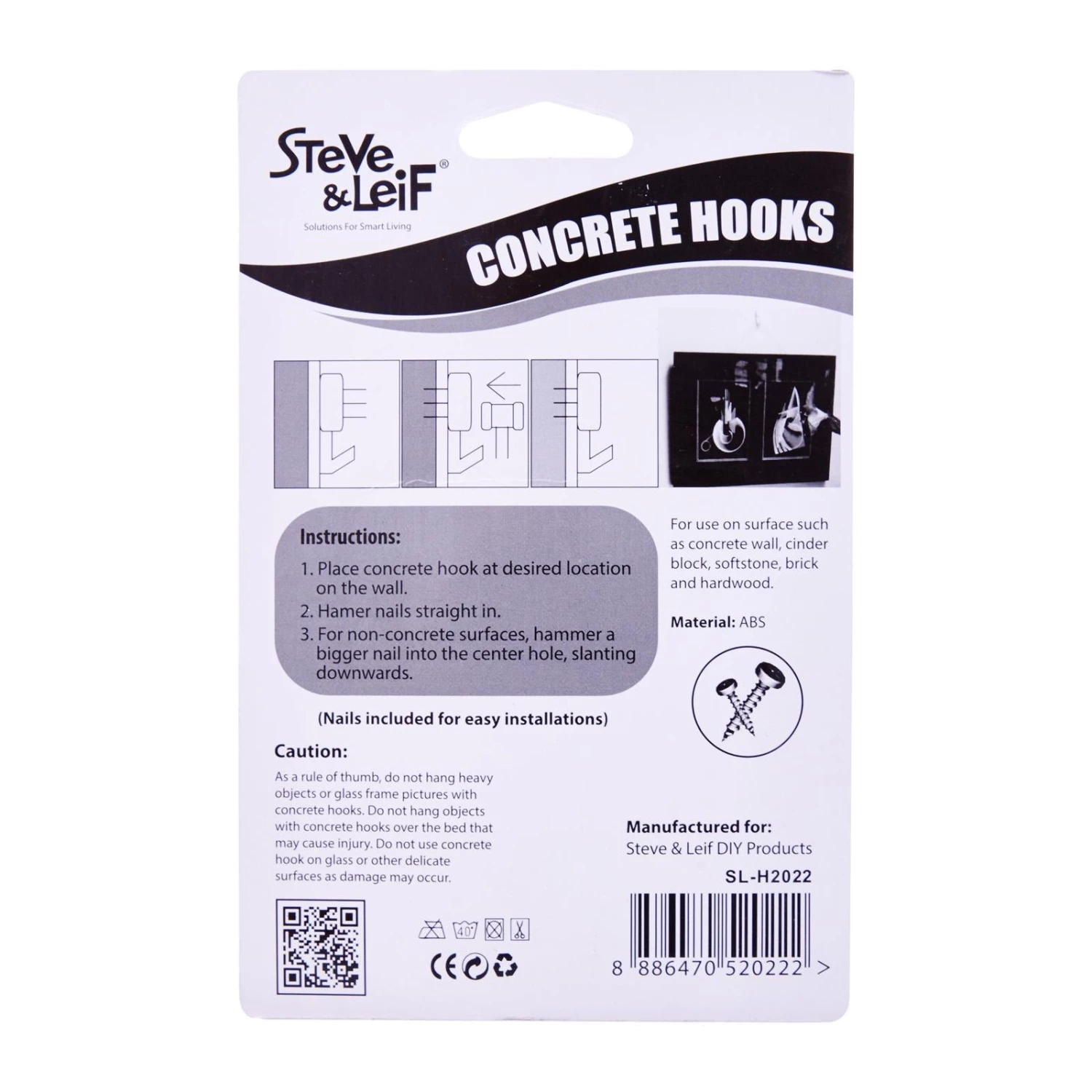 Steve & Leif’s Concrete Hooks can be easily attached to the wall and holds up to 2kg. Just hammer the nail into the center hole of the hook (nails provided) for easy installation. Ideal for hanging interior decorations such as picture frames, clock, mirror, and more!