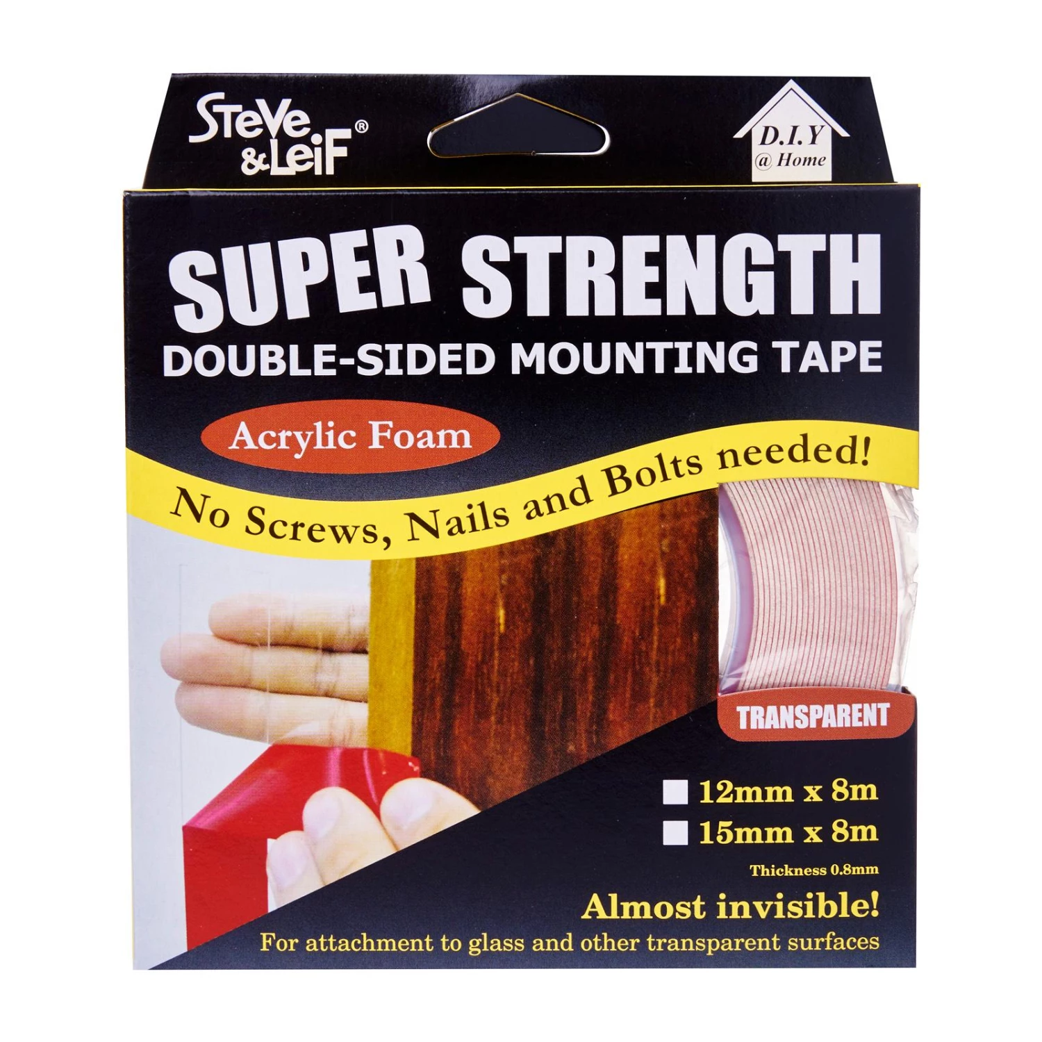 Steve & Leif’s Double-Sided High Bond Acrylic Foam Tape has excellent lamination property to the HSE surface of substrate such as glass, stainless steel, aluminium, Poly-Carbonate, ABS etc. Flexible and firm construction provide the excellent property for thermal, humidity and UV irradiation resistance. No screws, nails and bolts needed for application!