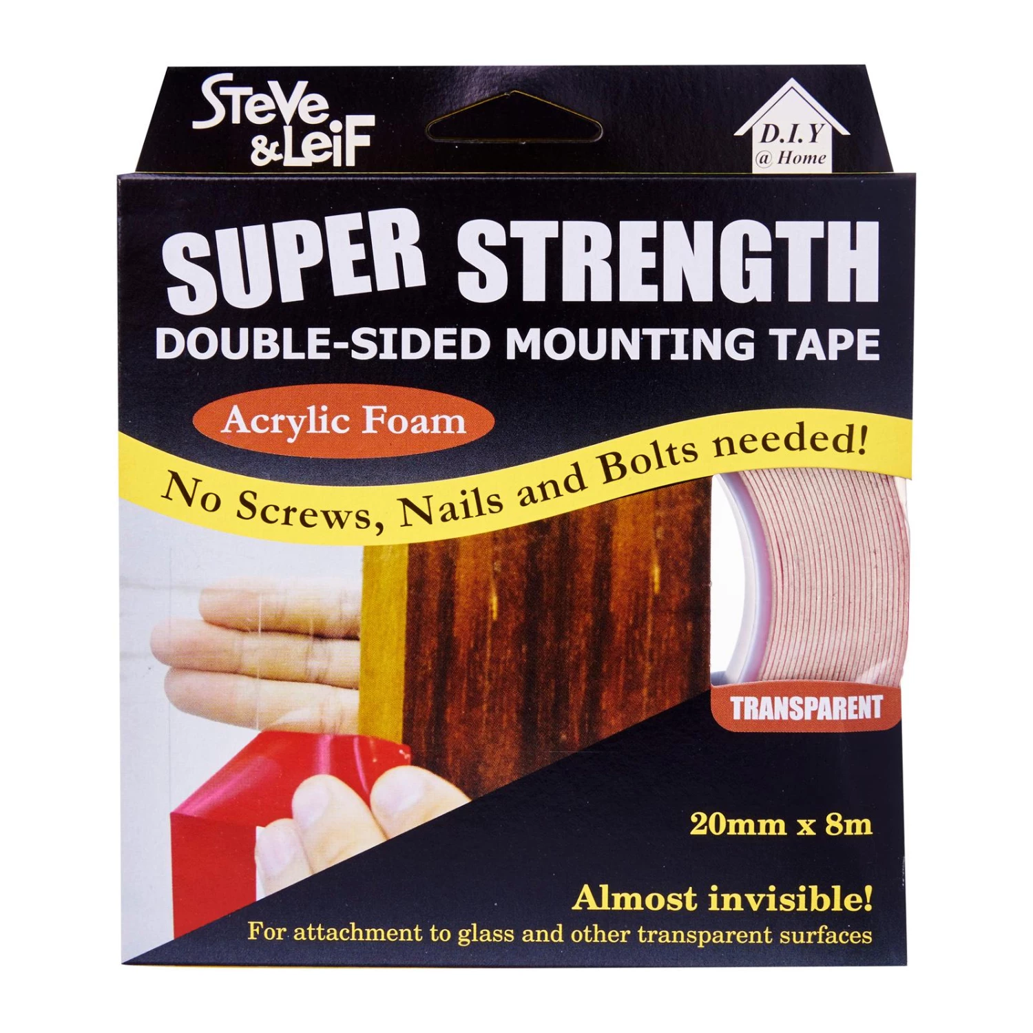 Steve & Leif’s Double-Sided High Bond Acrylic Foam Tape has excellent lamination property to the HSE surface of substrate such as glass, stainless steel, aluminium, Poly-Carbonate, ABS etc. Flexible and firm construction provide the excellent property for thermal, humidity and UV irradiation resistance. No screws, nails and bolts needed for application!