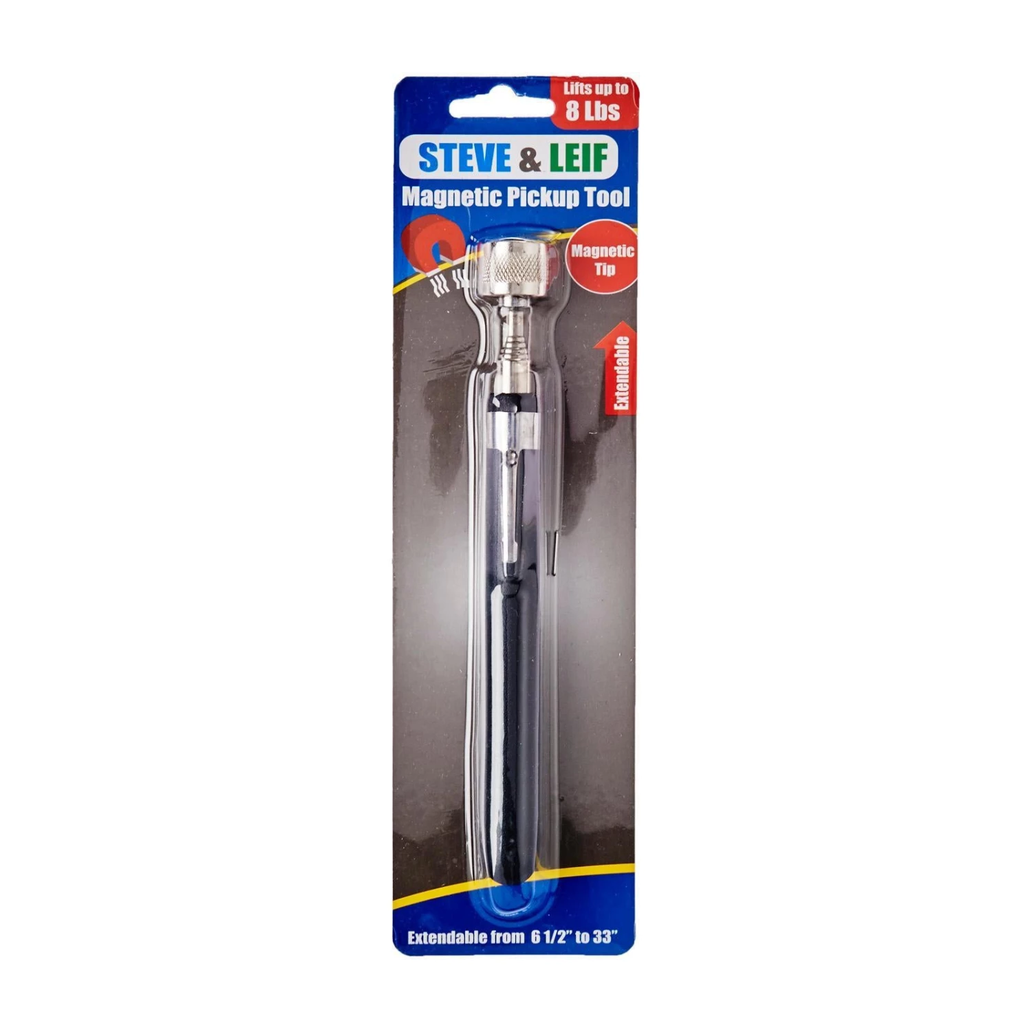 Steve & Leif’s Magnetic Pickup Tool is a lightweight pen size tool which is easy to carry around. Strong magnetic tip able to retrieve up to 8lbs ferrous metal objects. The pickup tool unextended length is 6.5″, extended maximum length is 33″.