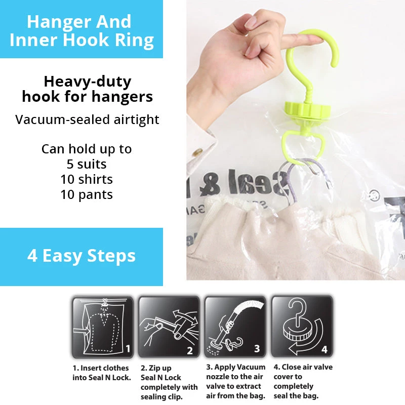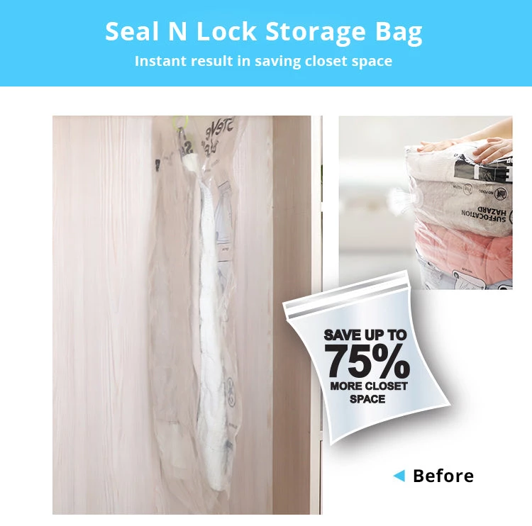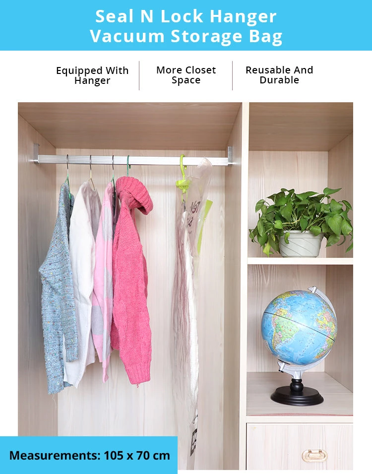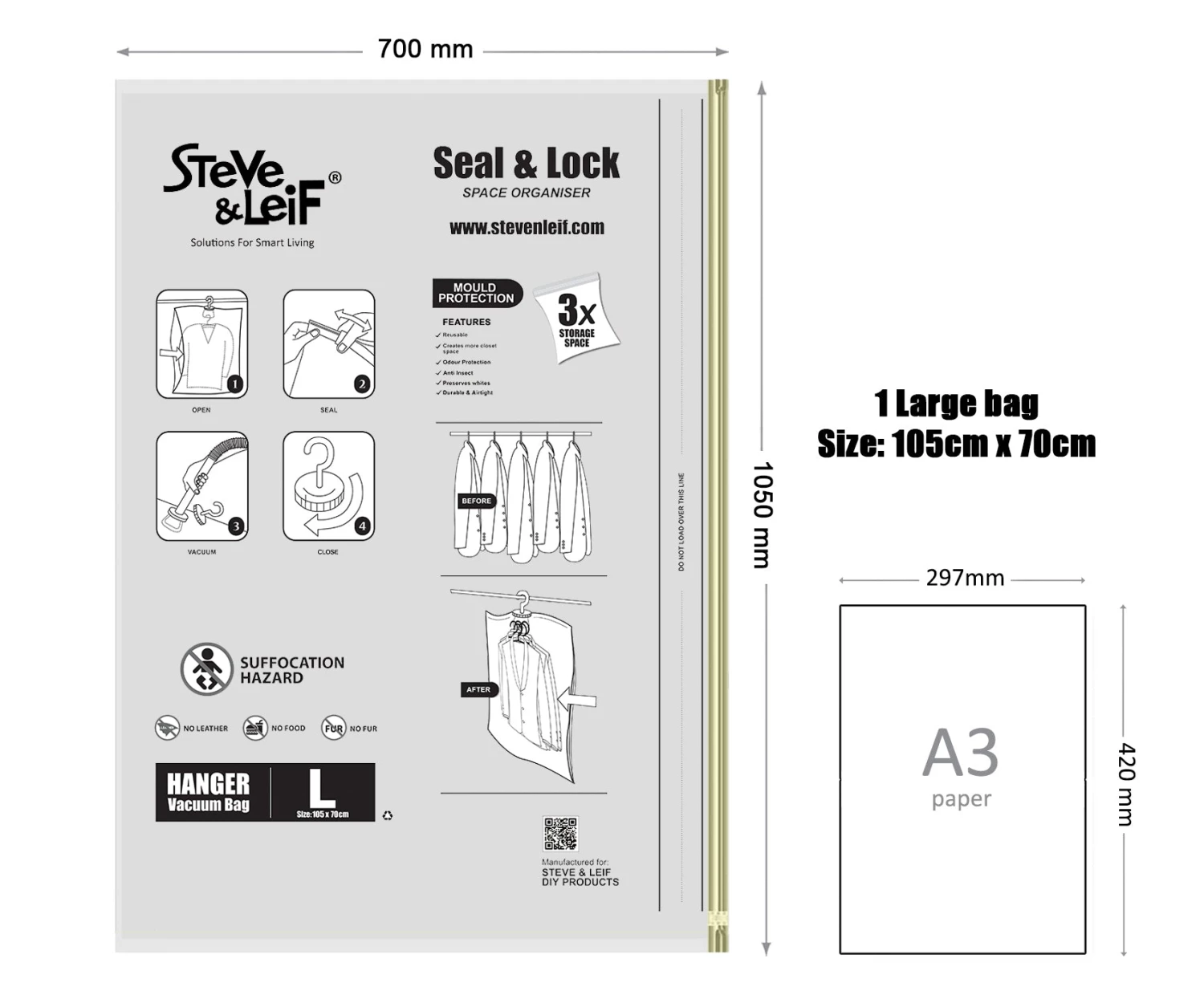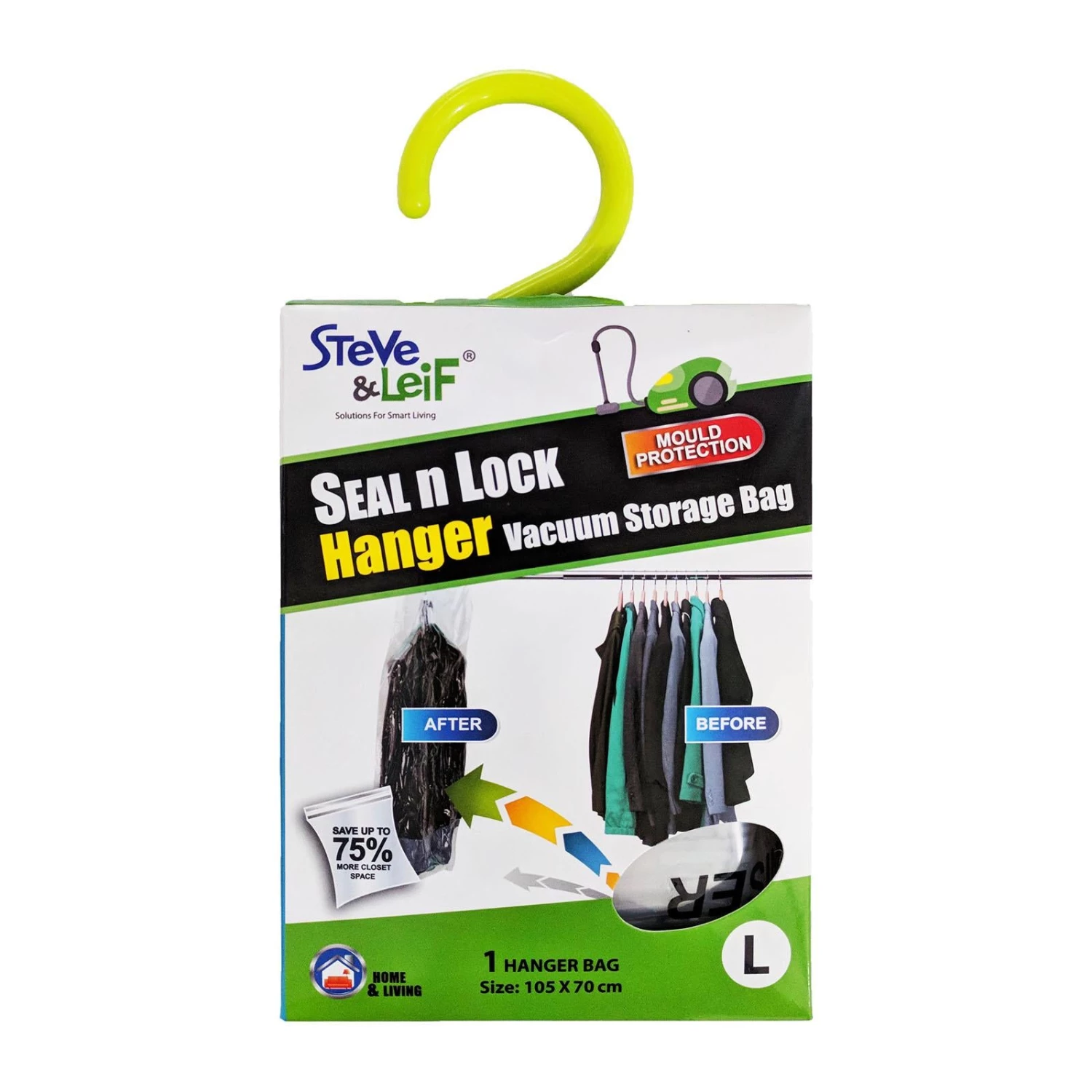 Steve & Leif’s Seal & Lock Hanger Vacuum Storage Bag is durable and perfect for your storage needs which save up to 75% more closet space! Simply lay flat and vacuum the excess air from the bag and you are ready to go. Keep all your bulky items compressed to make more room in your cabinet!
