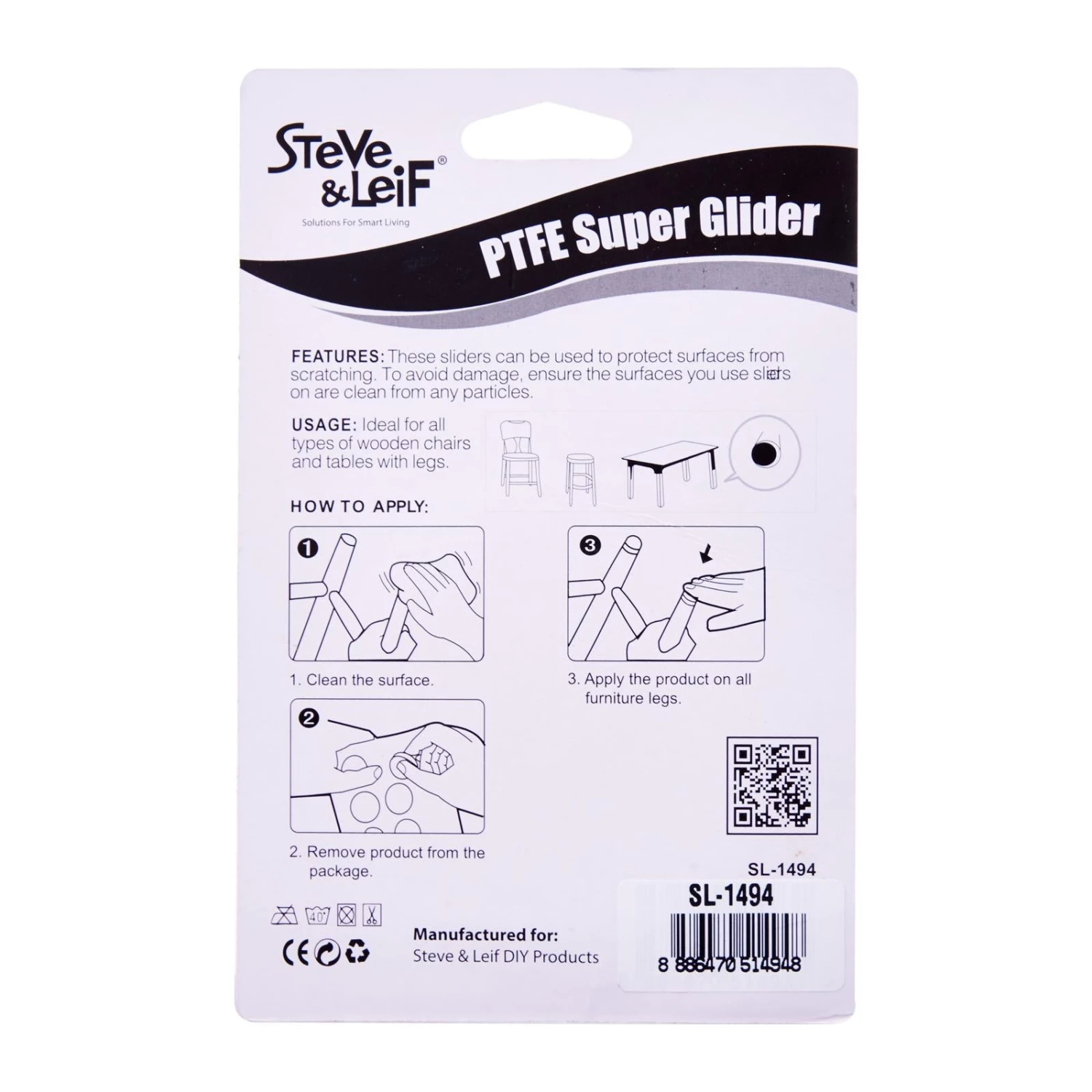 Steve & Leif’s PTFE Super Gliders can be used to protect surfaces from scratching and sliding. Self-adhesive anti-skid round pads work best on hard floor surfaces. It’s easy to use, just peel and stick! Ideal for all types of wooden chairs and tables with legs.