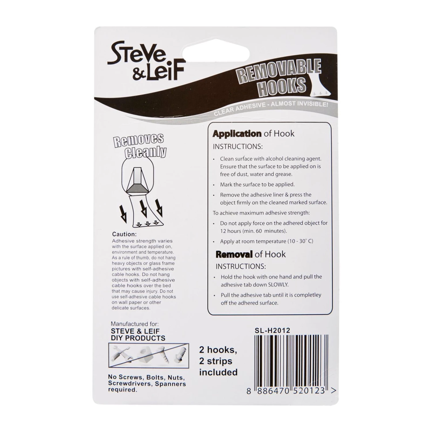 Steve & Leif Removable Hooks are easily removable and able to hold up to 1kg. Forget about screwing or nailing as removable hooks are fast and easy to hang your favorite item up on the wall! No damage on mounting surface or leave any residue as it removes cleanly.