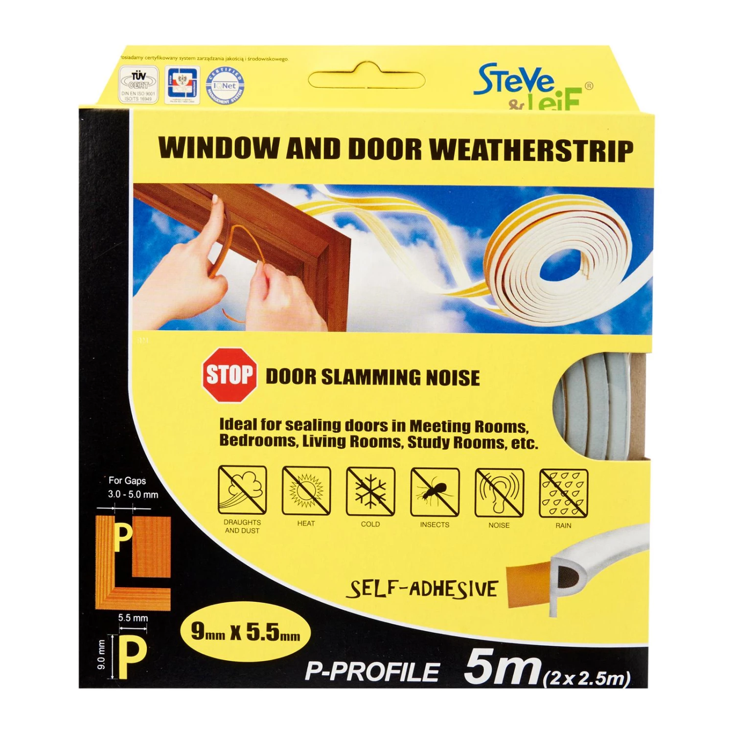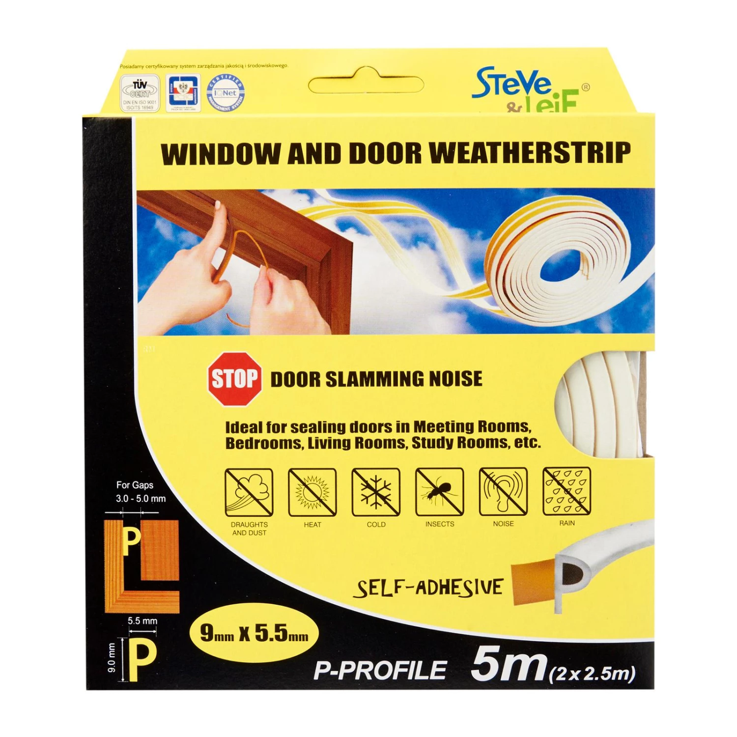 Steve & Leif’s P-Profile Weather Strip made of cellular foam (sponge) EPDM rubber that has excellent resistance to ozone, oxidants and severe weather conditions. EPDM is commonly used sealing material for windows and doors. Ideal for sealing doors in Bedrooms, living rooms, study rooms, meeting rooms, etc. for cushioning effect when closing. Available in Black, Brown, Grey and White to match your home interior design.