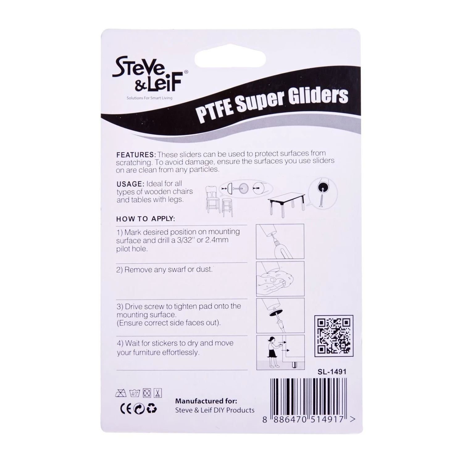 Steve & Leif’s PTFE Super Gliders can be used to protect surfaces from scratching. Ideal for all types of wooden chairs and tables with legs. To avoid damage, ensure the surfaces you use sliders on are clean from any particles. Screw the tighten the pad onto the bottoms of the furniture legs to move your furniture effortlessly.