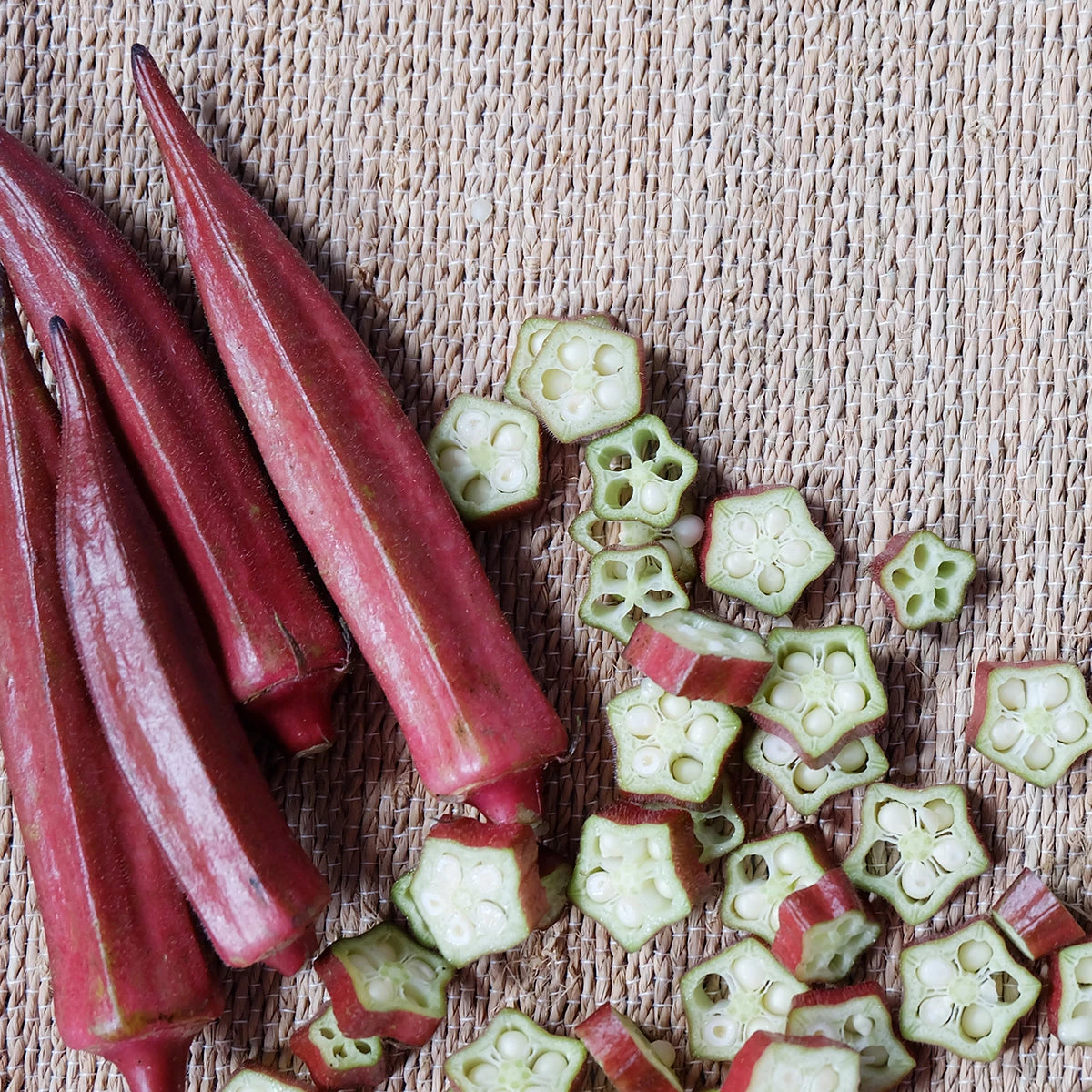 Red okra has an unique flavor and texture, the fresh taste issomewhere between eggplant and asparagus. It adds a touch of color to salad.