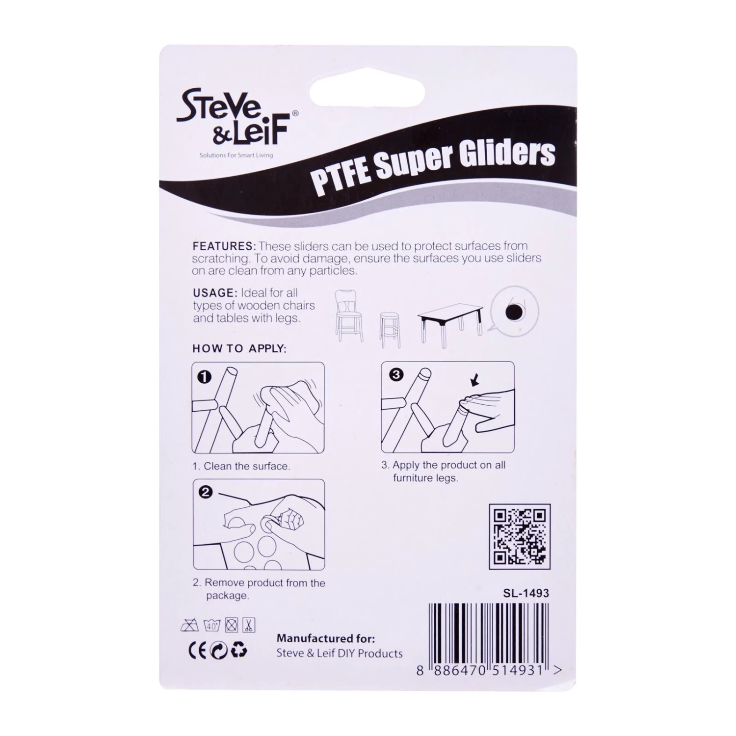 Steve & Leif’s PTFE Super Gliders can be used to protect surfaces from scratching and sliding. Self-adhesive anti-skid round pads work best on hard floor surfaces. It’s easy to use, just peel and stick! Ideal for all types of wooden chairs and tables with legs.
