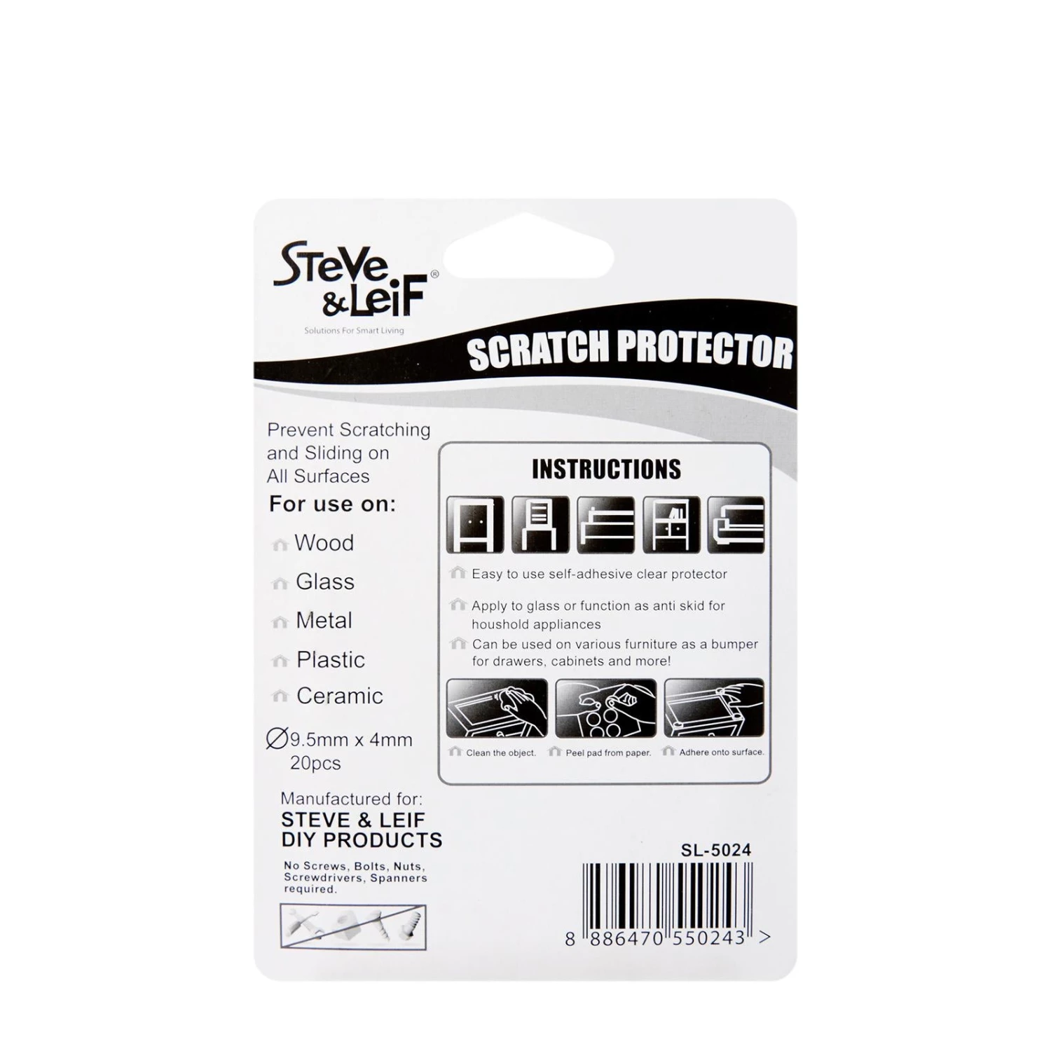 Steve & Leif’s Scratch Protector helps to prevent scratching and sliding on all surfaces. Reduce sound and impact resistance when closing sliding doors or drawers. Self-adhesive clear protector which is easy to use, you can just peel and stick!
