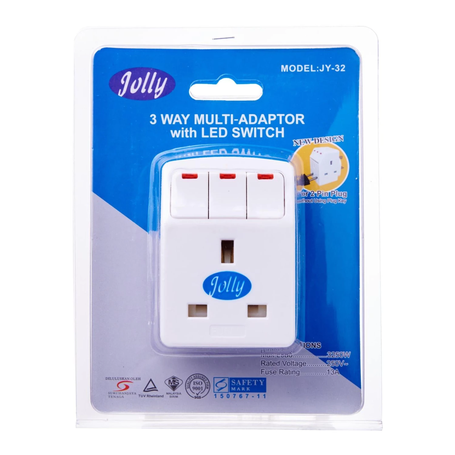 3 Way Multi Adaptor with LED switch is safety marked and approved based on singapore standards. It is 2 pin friendly, so users can plug in appliances with 2 pin plug directly without the need for additional adaptor. The locations of the sockets are on left, front, right of the adaptor, hence making it suitable for use on 1 main switch without the need for bulky trailing sockets. Packed in blister packaging.